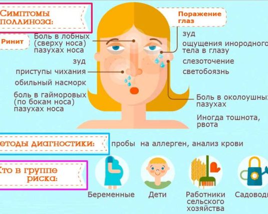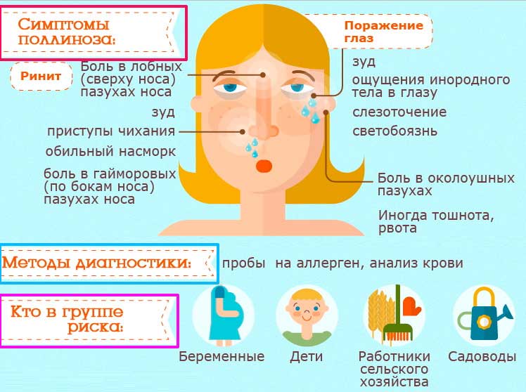 В большом числе случаев аллергический ринит сочетается с поражением глаз – аллергическим конъюнктивитом, который проявляется зудом в глазах, слезотечением, покраснением, выраженным отеком век. Иногда у людей с поллинозом, при употреблении продуктов, вызывающих перекрестную аллергию, могут возникать нарушения в работе желудочно- кишечного тракта. Не нужно забывать о таком грозном заболевании как бронхиальная астма, симптомы которого могут также возникать на фоне пыльцевой аллергии в виде приступов удушья, затрудненного дыхания, а также приступообразного сухого кашля и хрипов в грудной клетке.